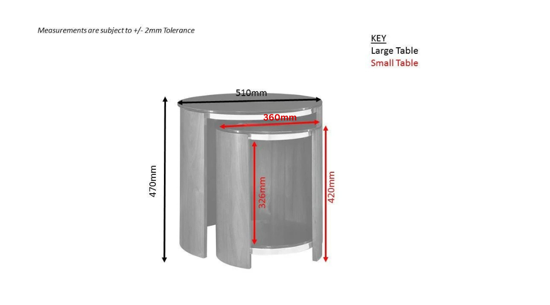 Large Table: Diameter 510mm x H470mmPerfect for entertaining guests or everyday use, these versatile tables can be used separately throughout your room or kept together as a stylish focal point. The durable construction ensures years of reliable use, while the elegant design makes them suitable for both modern and traditional interiors.
