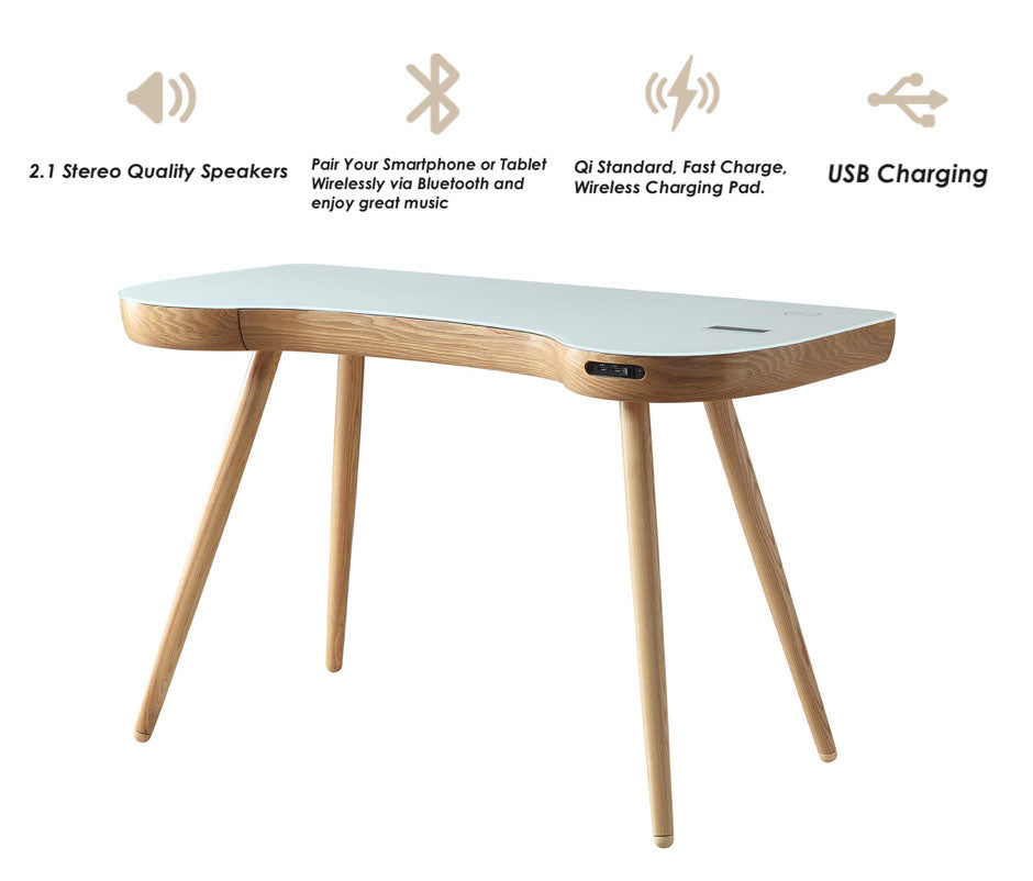 The PC711 San Francisco Smart, Speaker, Charging Desk is innovative, practical and stylish. First impressions are of a unique, stylish, modern design. The reality is a desk that it is packed with technology, featuring Bluetooth compatible speakers, discreet wireless charger built into a modern super white glass, 2 x USB ports and also a concealed drawer ideal for storage. Whether you are listening to your favourite music or charging your phone whilst working from home, this desk is bringing furniture up to speed with the millennial lifestyle of today. This product is ideally purchased with the new PC712 executive office chair in Oak.